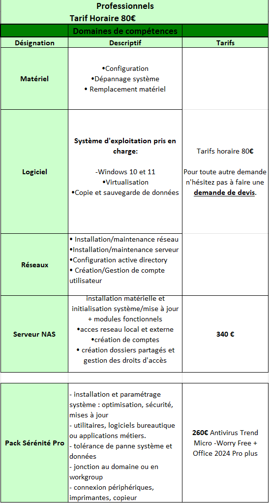 Sur le matériel et réseaux ainsi que pour vos serveurs, et pour les particuliers de l'aide pour le dépannage PC, configuration et des formations.